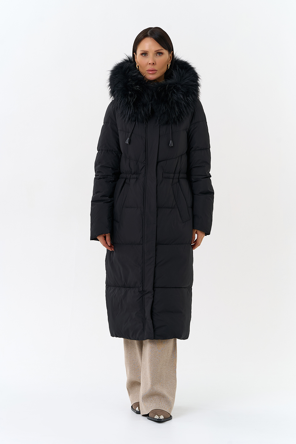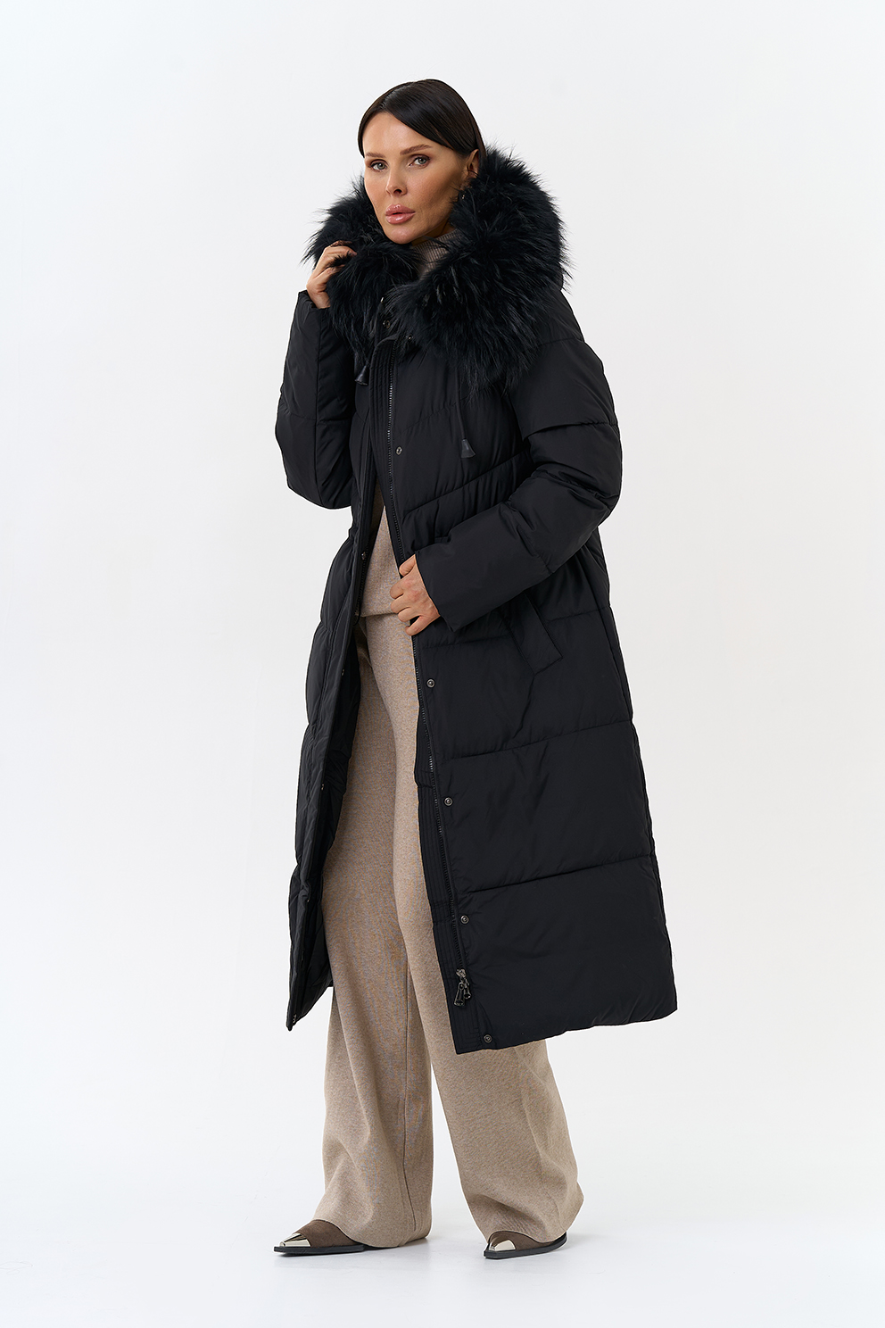Крой воротника - капюшон, отделка чернобурка