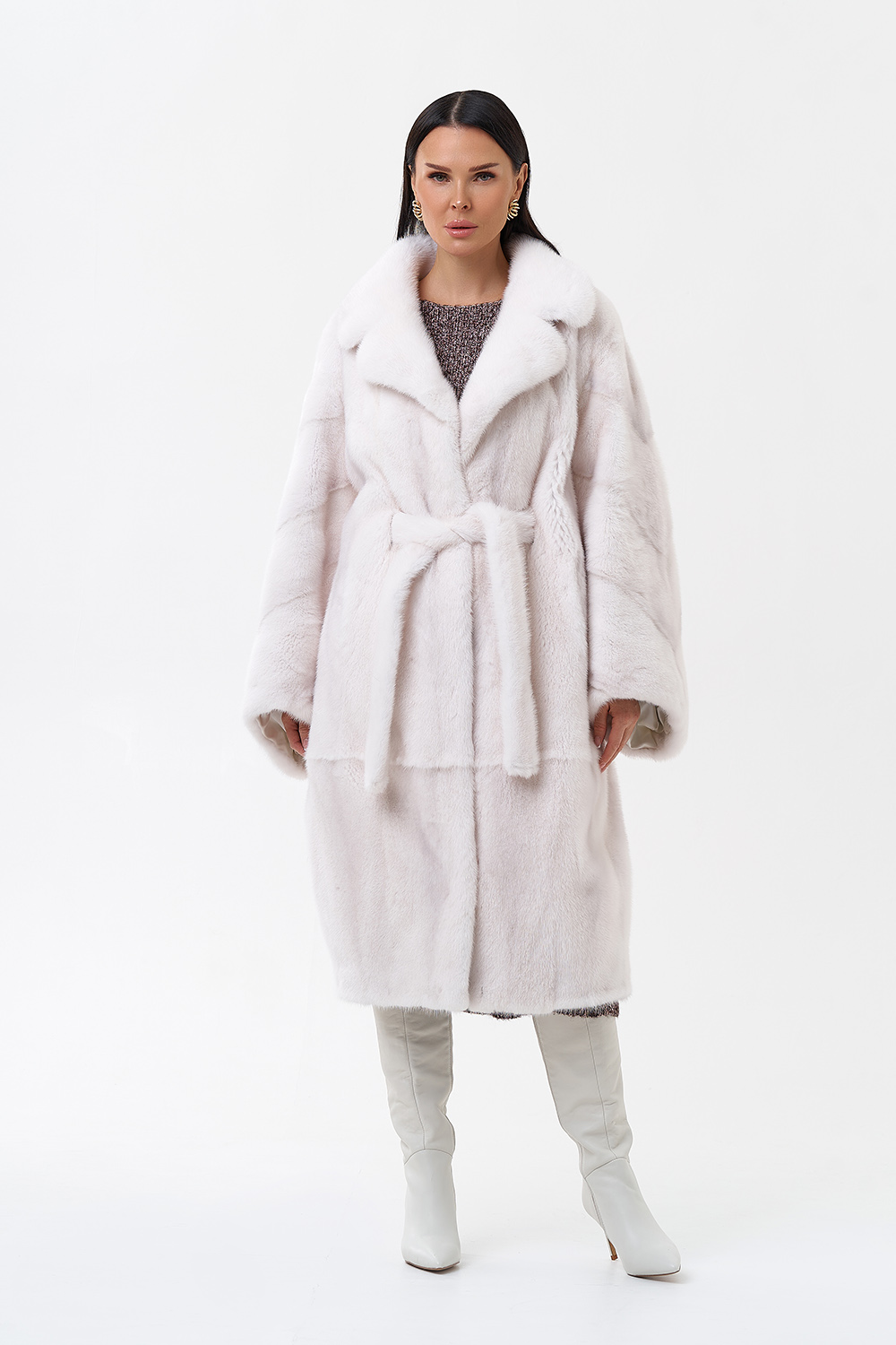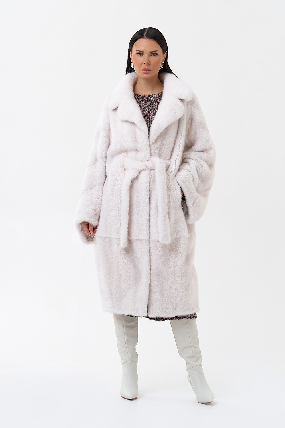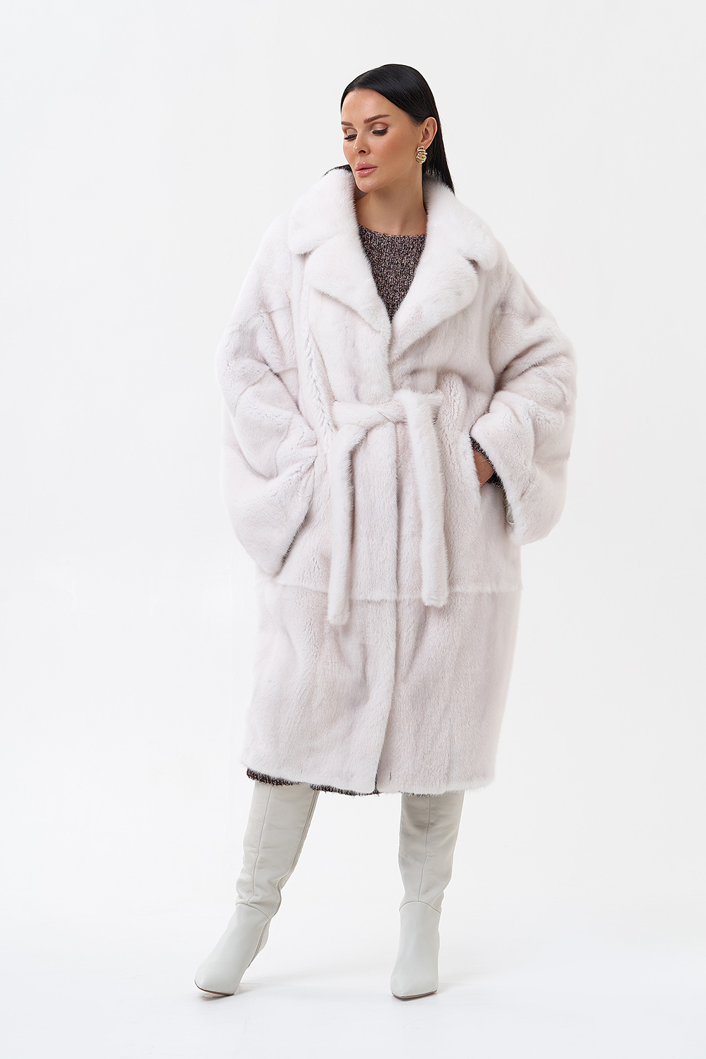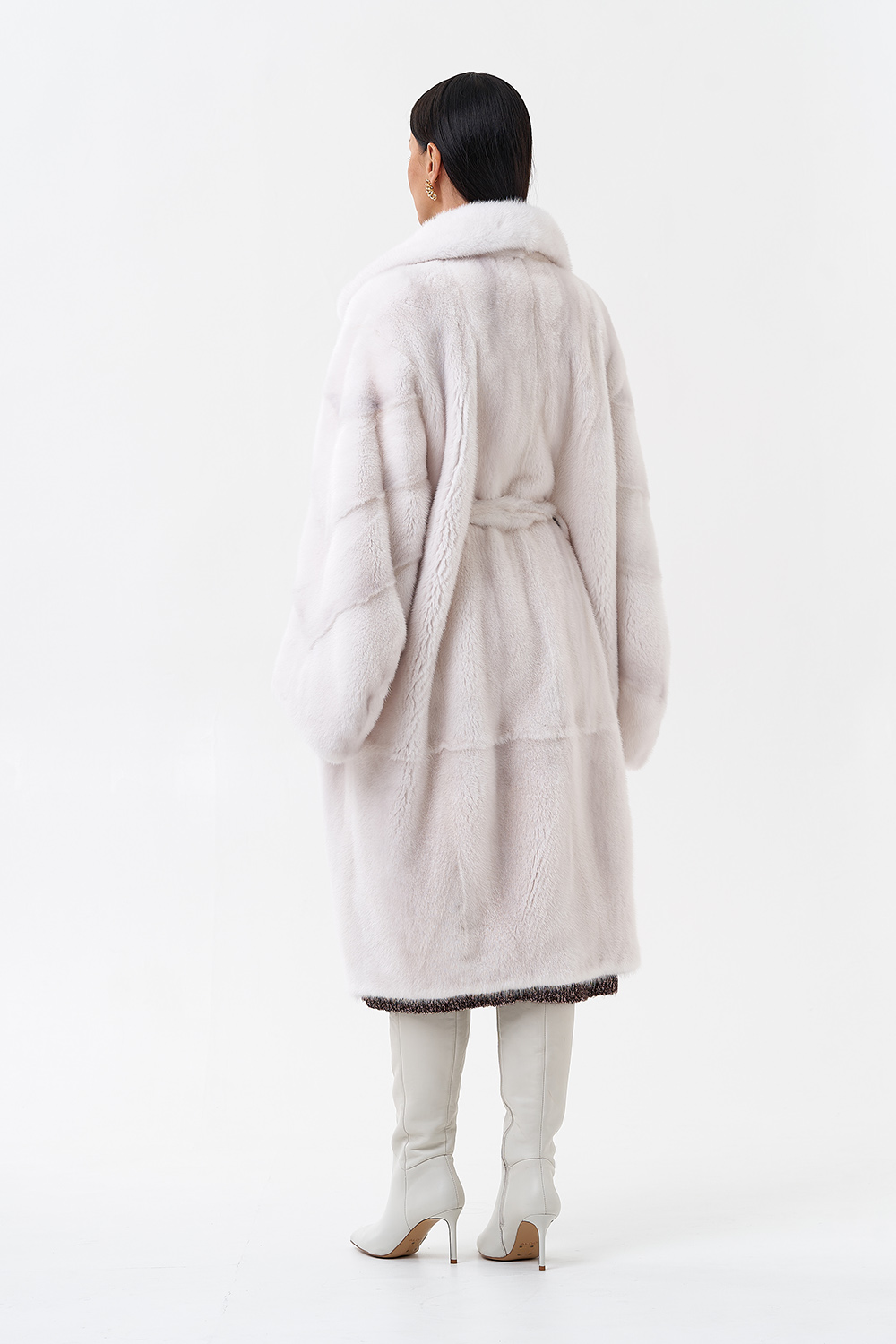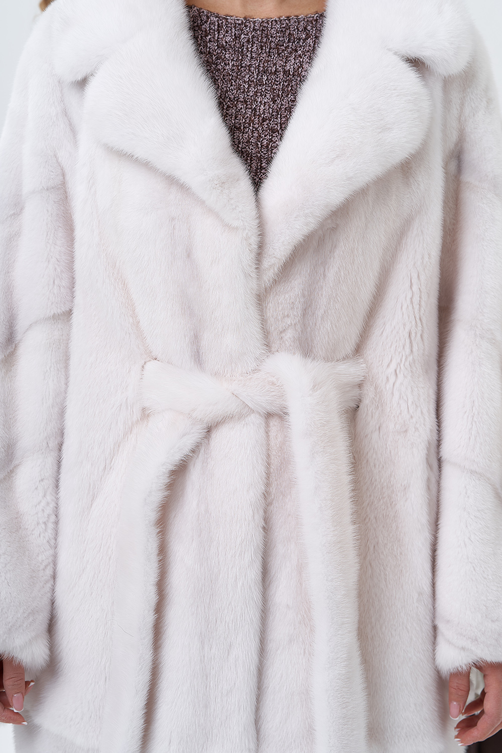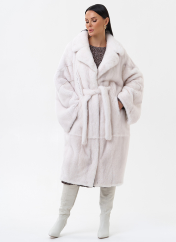 Норковая шуба в комбинированной раскладке с поясом