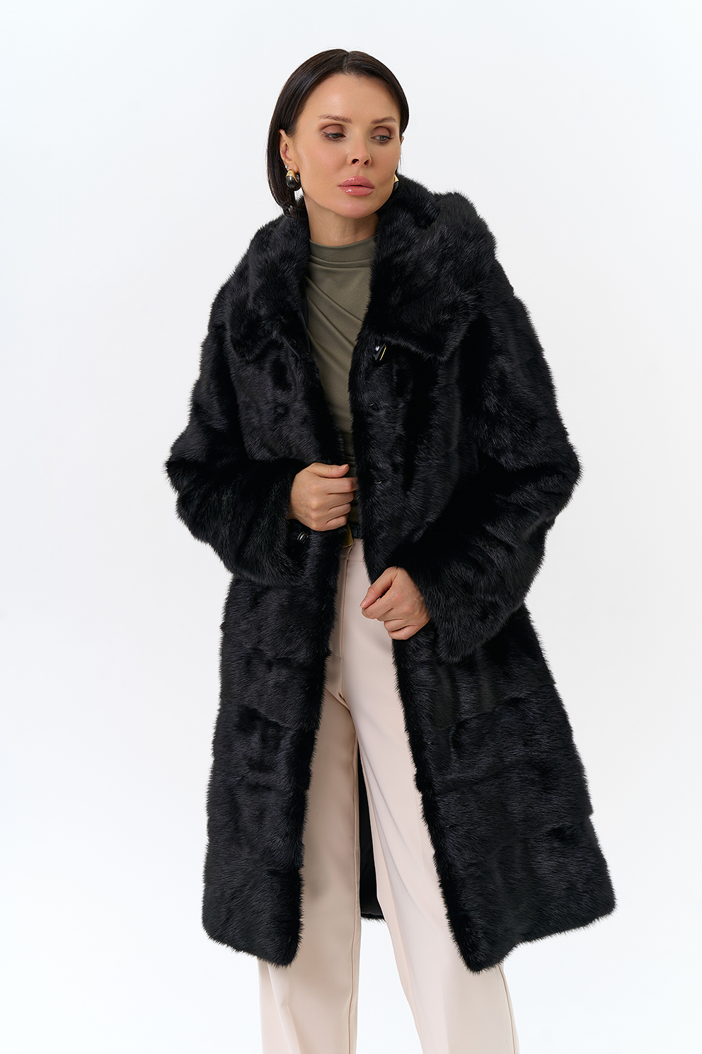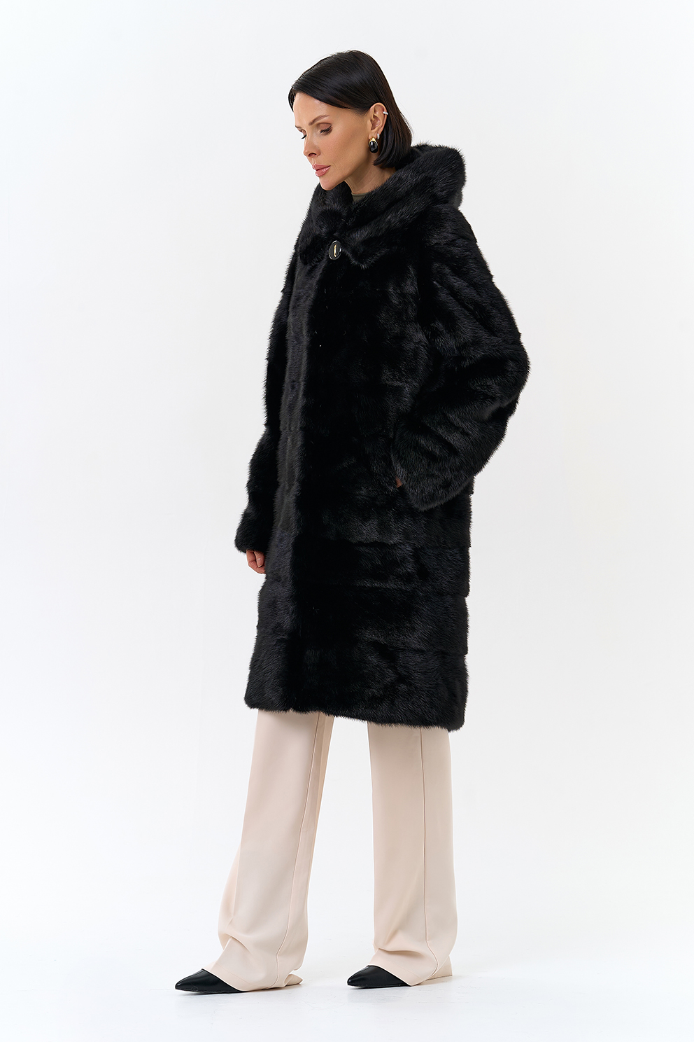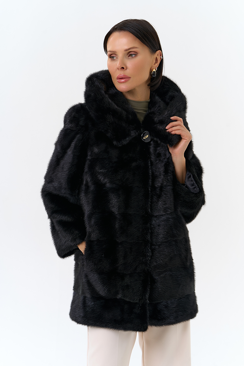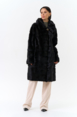 Шуба из меха норки черного цвета. Изделие средней длины, но его можно укоротить, как и рукава. Застегивается с помощью шубных крючков и пуговицы. Модель прямого фасона и дополнена объемным капюшоном. Раскладка меха - поперечные пластины. Подклад из полиэстера износоустойчив и позволяет носить шубу долгое время. Модель сочетается как с брюками, так и с юбками.